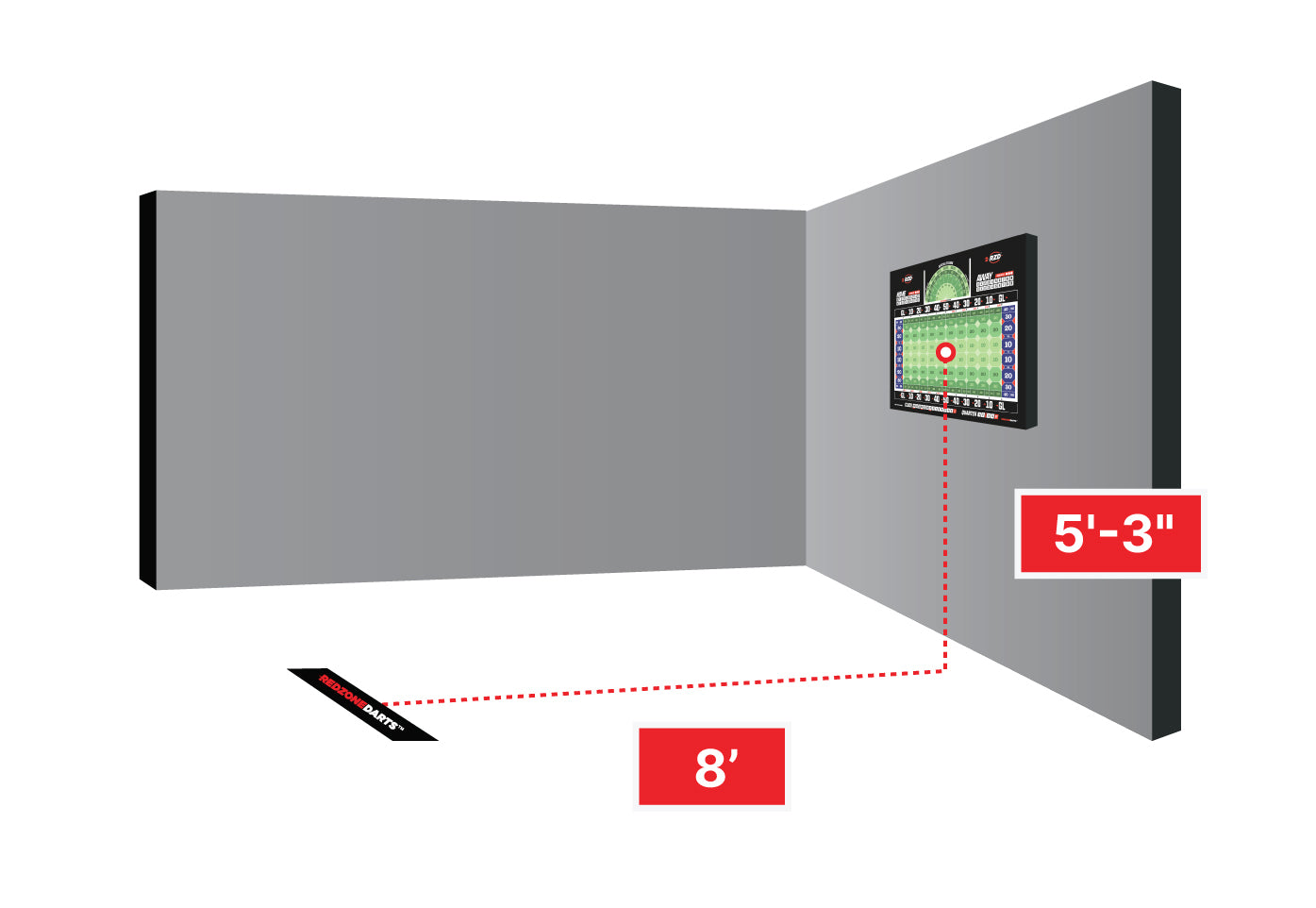 - The throwing line rests 8'-0" away from the front of the dart board